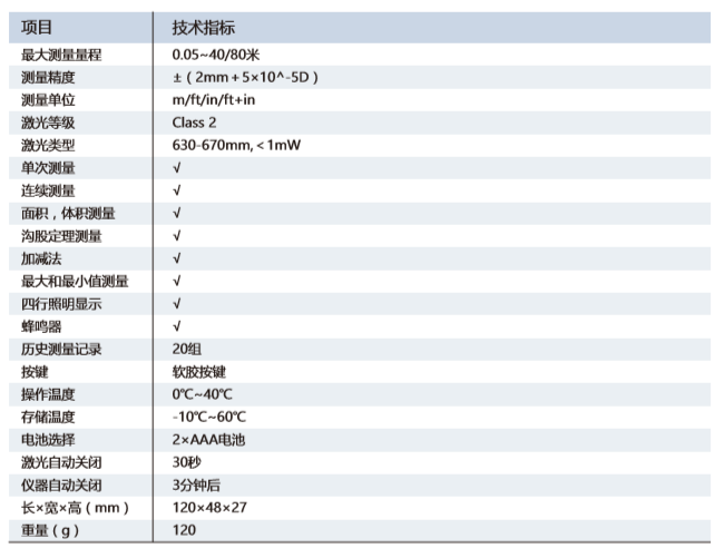具有连续测量、面积测量、体积测量、勾股定理测量、角度测量、自动水平测量、自动垂直测量等多种 测量功能。