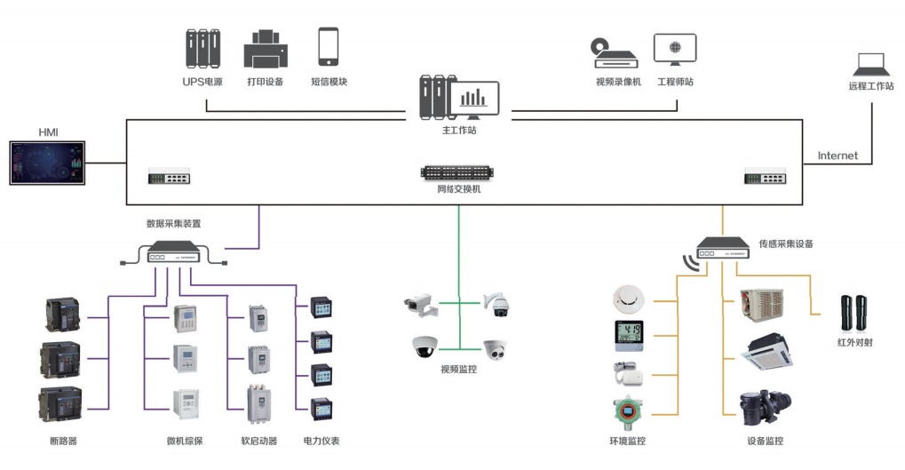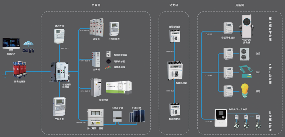配电监测及用电安全系统对变配电环节的微机保护装置、数字显示仪表、智能断路器、线缆温度、环境烟雾、水浸等传感器进行采集监测、远控、集抄、统计、分析,帮助用户实现配电环节实时监测和运行管理,以便及时分析预防配电事故、提高用电的安全可靠性及智能化管理水平。